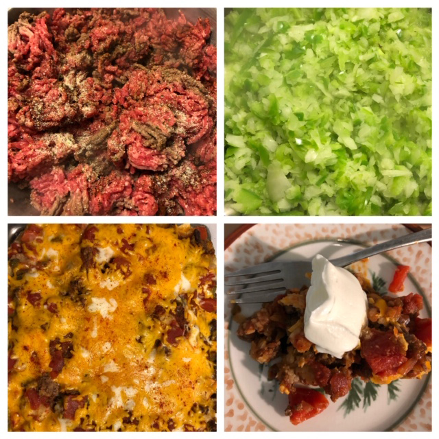 I’ll wrap up by saying I tried the casserole by Amy Jo Cook, which started this whole recipe swap. I decided to go Mexican style with Amy’s recipe, using ground round, tortilla chips, cheddar cheese, and taco seasonings with smoked paprika. I also sautéed chopped green bell pepper and onions to add to the layers.