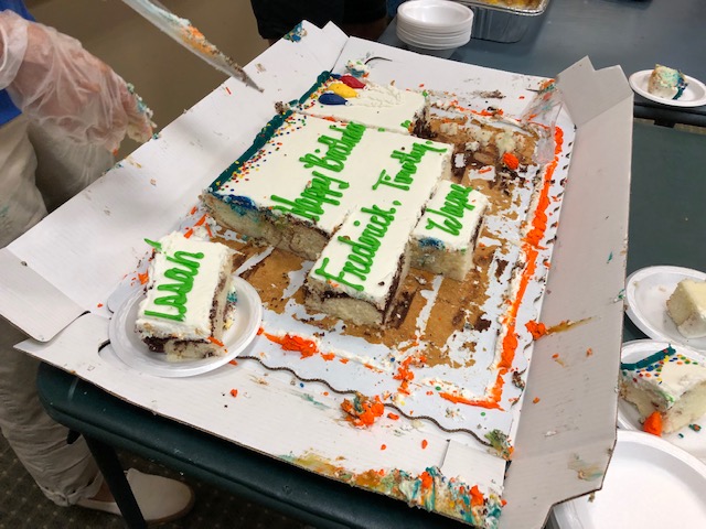 In fact, I’m told three people are here tonight with August birthdays. The giant monthly birthday cake has several names on it, but Walter, Isaiah, and Rommel reportedly have already picked up their personalized slices.