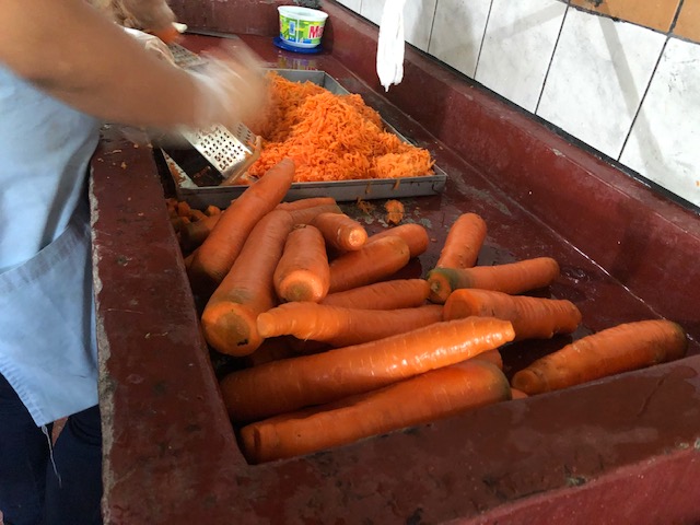 It was not only interesting to watch the catering team work quickly and efficiently in the small, open, hot kitchen, without electric dishwashers or food processors or other tools existing in the typical U.S. kitchen. I was also interested in the menu, which was healthier than the typical youth-retreat diet in my home state.