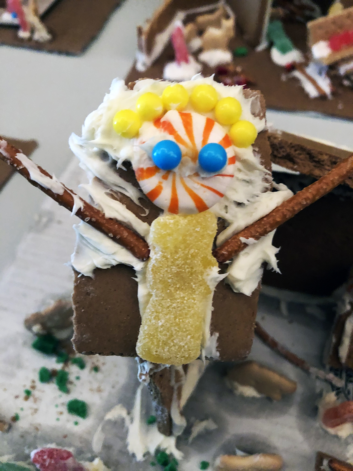 Melissa walked me over to the table where the gingerbread nativities were on display. The creation voted “best of show” featured a pretzel star and graham-cracker manger …. “But this one is my favorite: the angel with the blue eyes,” said Melissa.