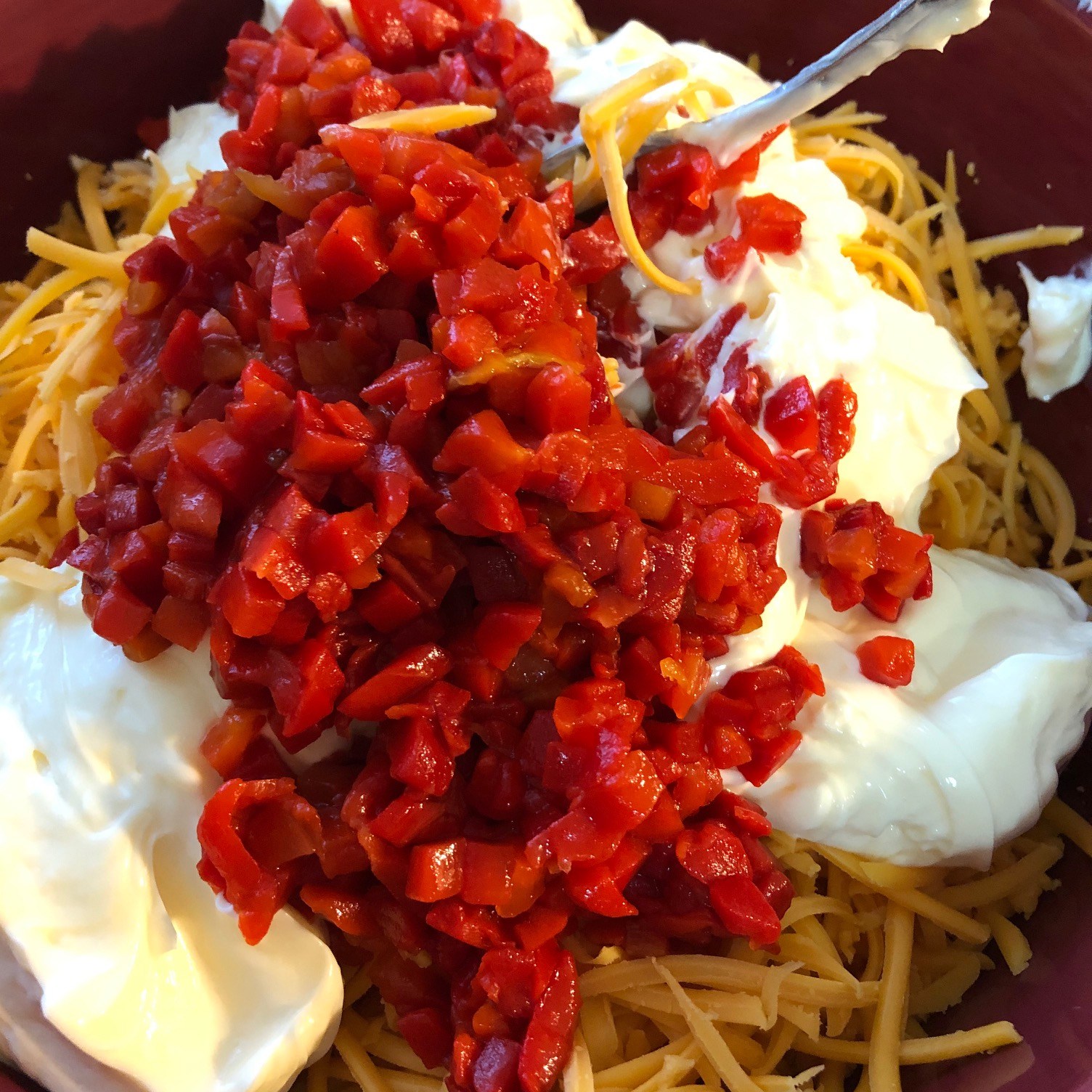 I went searching for a pimento cheese recipe and found a variety. Some included chipotle, or Worcestershire, or pickles, or cream cheese, or onions, or a mixture of shredded cheeses and other ingredients.