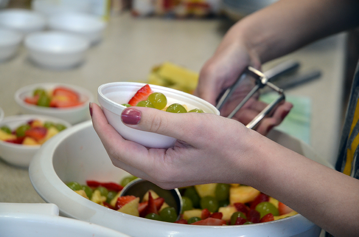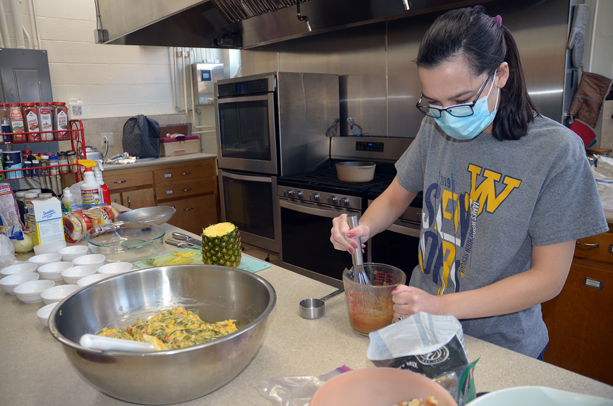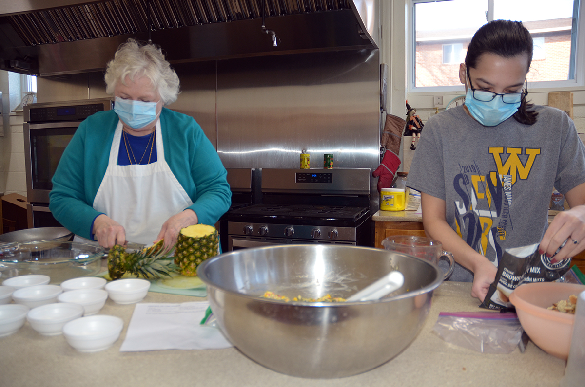 Today, only one student accepted her offer. Sophomore Ashley Verburg is in the kitchen with Martee, cheerfully preparing gravy and scooping multi-colored fruit into Styrofoam bowls.