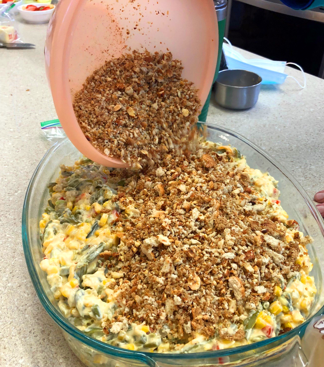 Martee Buchanan served this casserole to us during a recent visit to the Wesley Foundation at Radford University. I loved the colors in the dish along with the mixture of vegetables and of course, the taste! I like traditional green bean casserole – with the French fried onions and canned soup – but I like this one even more. It’s very easy to make. We’ve decided to serve Martee’s casserole at our next free takeout meal on the Saturday before Easter, beautifully paired with the Easter ham!