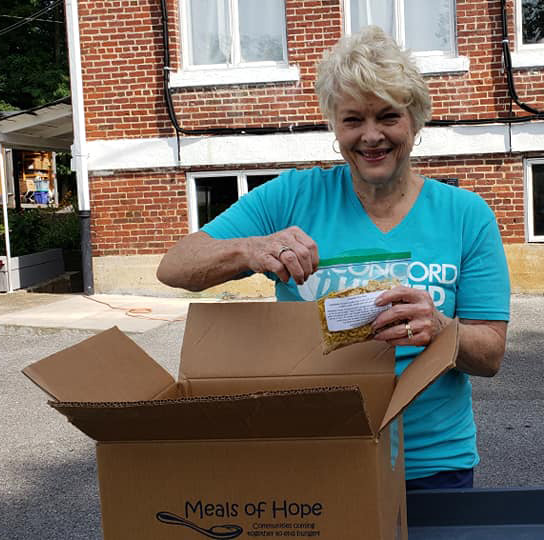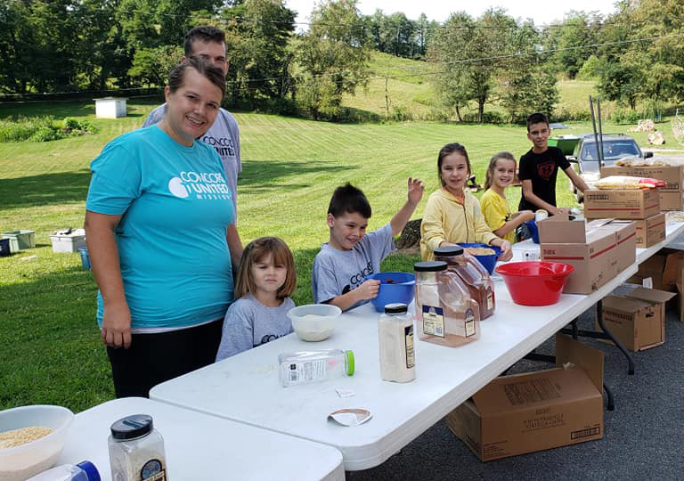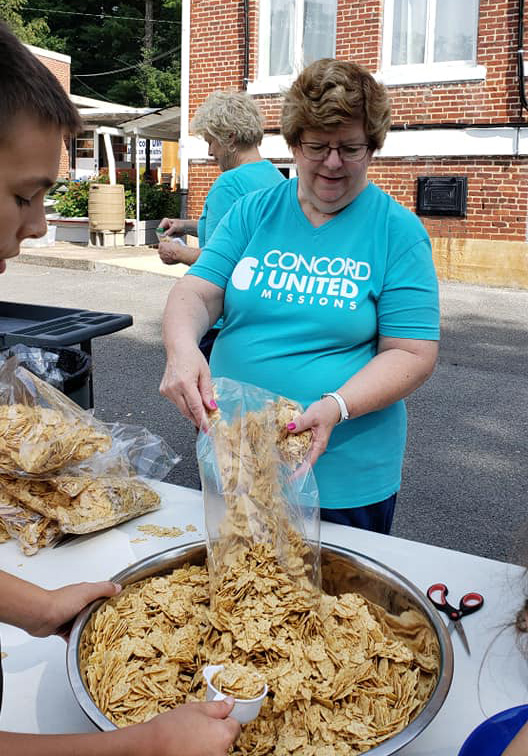 A few times a year, volunteer teams at Concord assemble these 8-serving bags including elbow macaroni, crushed tortilla chips, brown gravy mix, chili powder, oregano, cumin, minced onion and garlic salt.