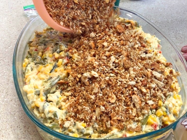 Green Bean & Corn Casserole: Another great recipe from the Martee Buchanan collection: A mix of colorful vegetables — some fresh, some frozen — mixed with cheese, sour cream, and soup and topped with butter-doused stuffing and almonds.